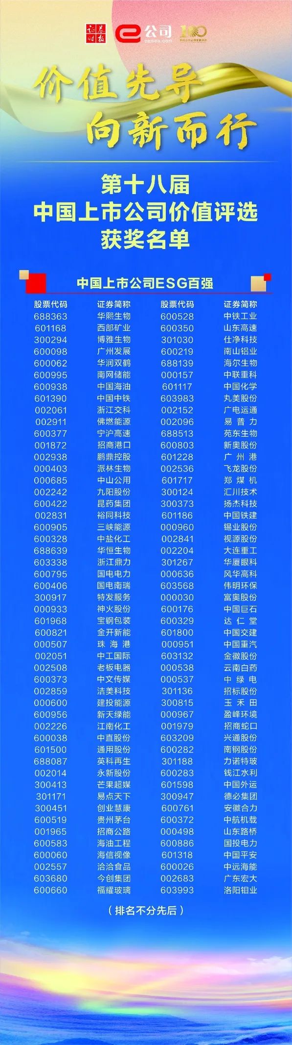 为激励上市公司更好地开展ESG实践,并为投资者了解企业的ESG表现及风险提供参考,人民日报社旗下的主流财经媒体平台证券时报自2021年起开始推出上市公司ESG百强评选。今年,证券时报将“上市公司价值评选”体系优化升级,评出“中国上市公司ESG百强”,表彰在ESG实践方面主动作为、成效突出的上市公司,引导和推动上市公司贯彻落实新发展理念,做ESG行动派,助力中国经济高质量发展。