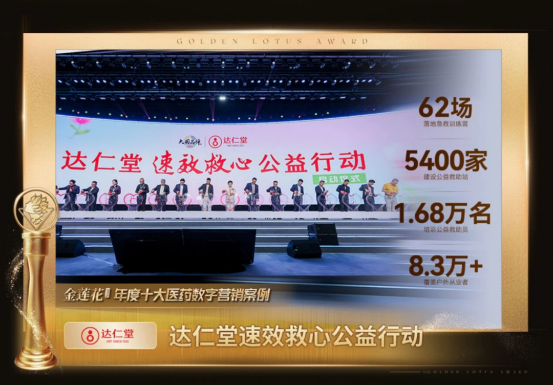 大会期间,「金莲花奖·2025」年度医药数字营销案例揭晓。经专业评审团与大众投票综合审定,“达仁堂速效救心公益行动”荣膺「年度十大医药数字营销案例奖」。