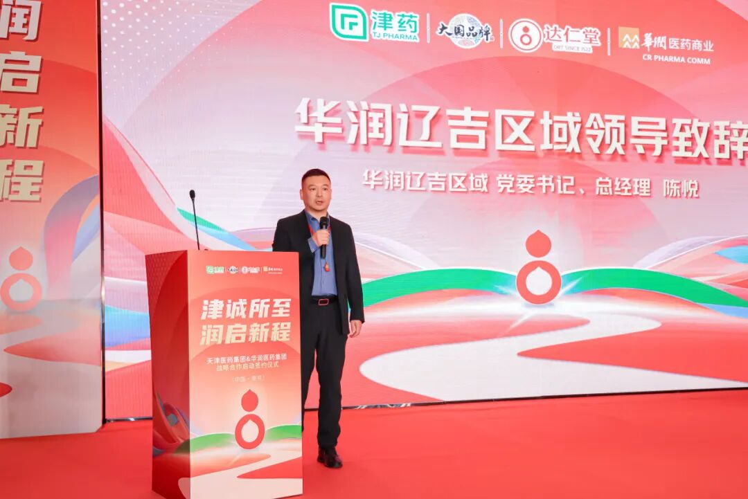随后,华润辽吉区域党委书记、总经理陈悦致辞。他表示,华润医药凭借全国多区域、多城市、多覆盖,搭建起行业领先的供应链服务体系,终端服务能力与渠道渗透力持续领跑。过往双方在产品配送、市场拓展等方面的协同已取得显著成效,此次战略升级将从区域合作向全国布局延伸,从单一业务协同向多领域互补拓展,为双方长远发展注入持久动力。